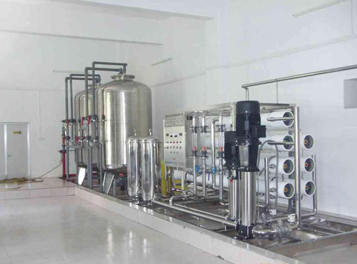 原水-原水加壓泵-多介質過濾器-活性炭過濾器-軟水器(或阻垢加藥裝置)-精密過濾器-第一級反滲透 -PH調節-中間水箱(可選)-第二級反滲透(反滲透膜表面帶正電荷)-純化水箱-純水泵-紫外線殺菌器- 微孔過濾器-用水點